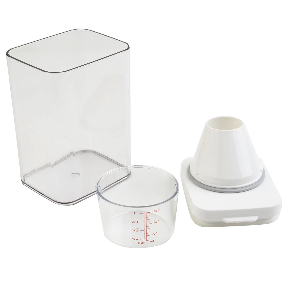 Material: jar body is high quality AS, lid is high quality PP, measuring cup is PET, external sealant ring is silicone, internal sealant ring is TPE